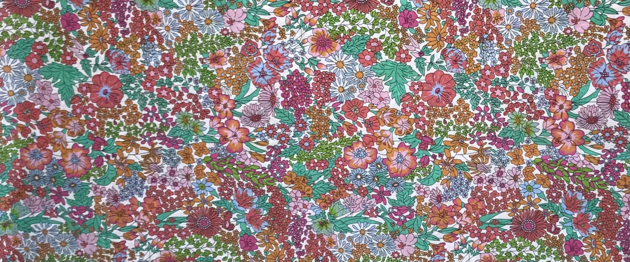 This fabric features a beautifully dense, all over floral print that feels like a wild garden in full bloom. A lively mix of blossoms ranging from delicate daisies to fuller, more intricate flowers is layered with soft greenery, creating a rich and continuous pattern with no empty space. The design has a slightly vintage quality, giving it charm and character while still feeling fresh and energetic.