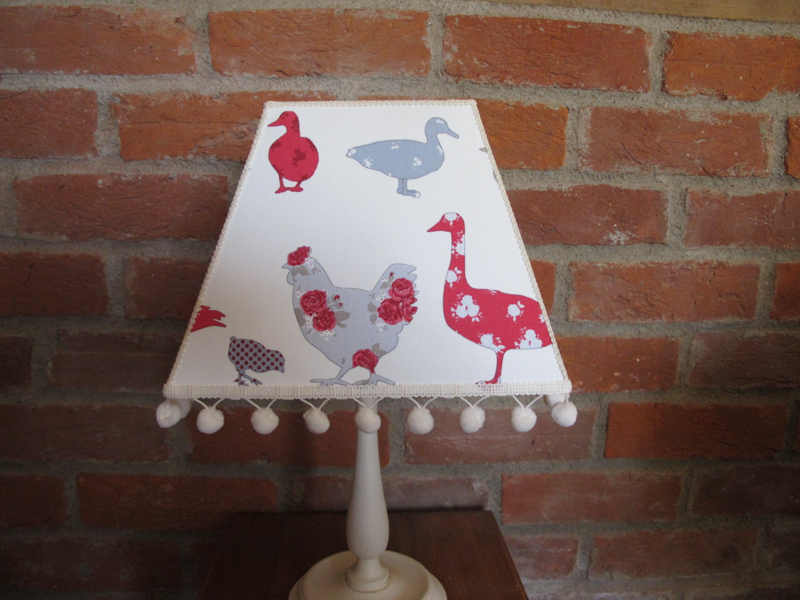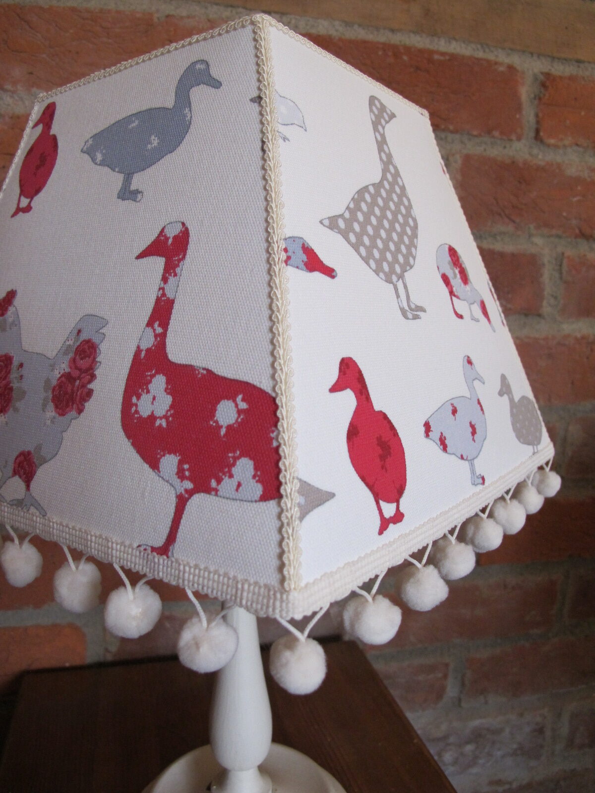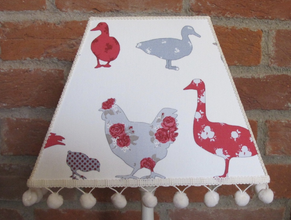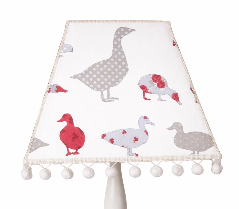A sweet lampshade featuring a delightful mix of ducks, geese and the odd chicken, in soft greys and warm reds, each with its own playful pattern.