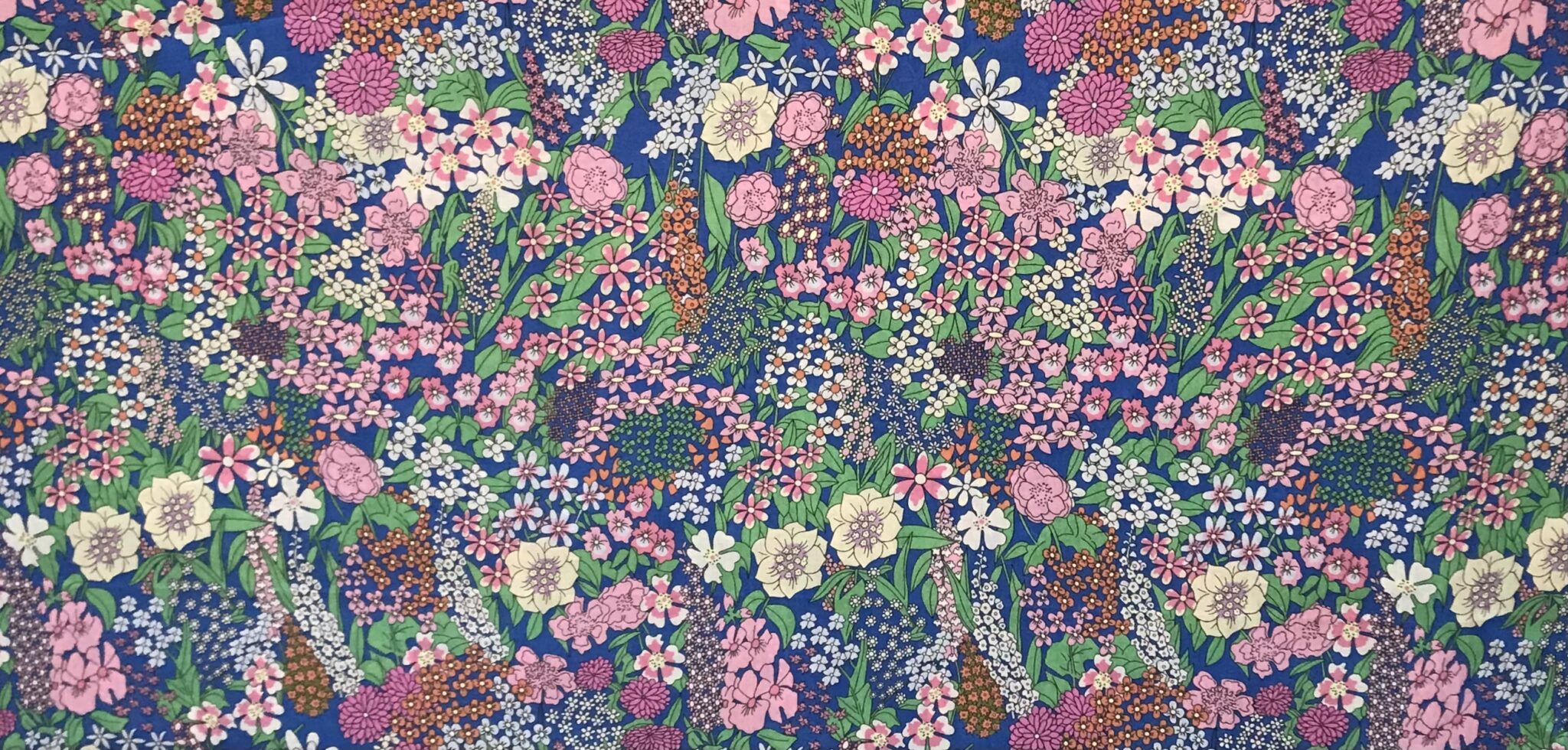 A rich, immersive floral print set against a striking deep blue background, this fabric captures the feeling of a twilight garden in full bloom. Delicate blossoms in soft pinks, warm corals, creamy whites, and hints of lilac are scattered in an abundant, layered composition, intertwined with fresh green foliage. The dense, all over pattern creates depth and movement, while the darker ground enhances the vibrancy of the colours, giving the design a more dramatic and sophisticated edge.