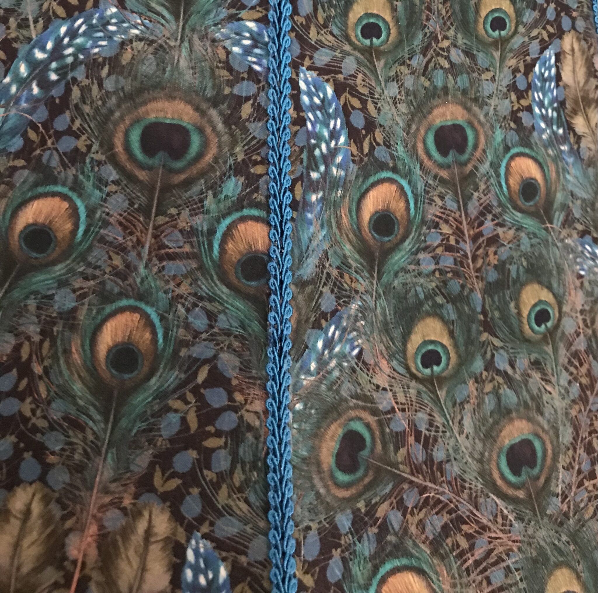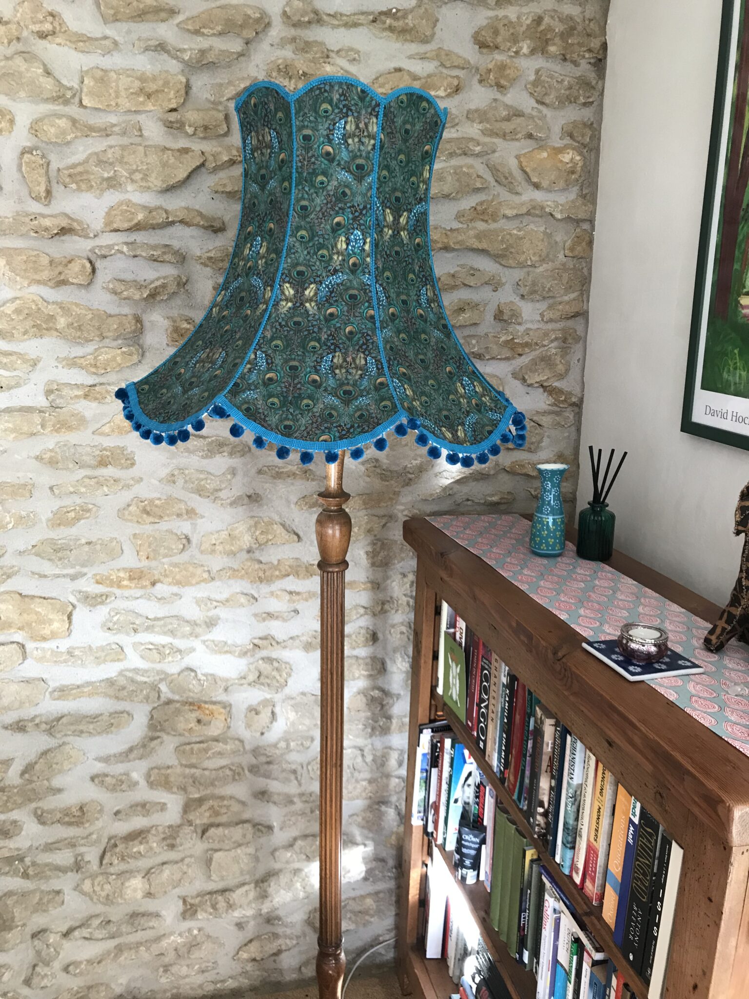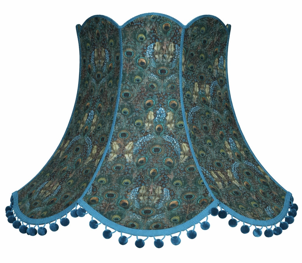 Add a bold, stylish statement to your home with this handcrafted lampshade. The fabric features a striking peacock-inspired design in rich teal and green tones, creating a vibrant and eye-catching look.