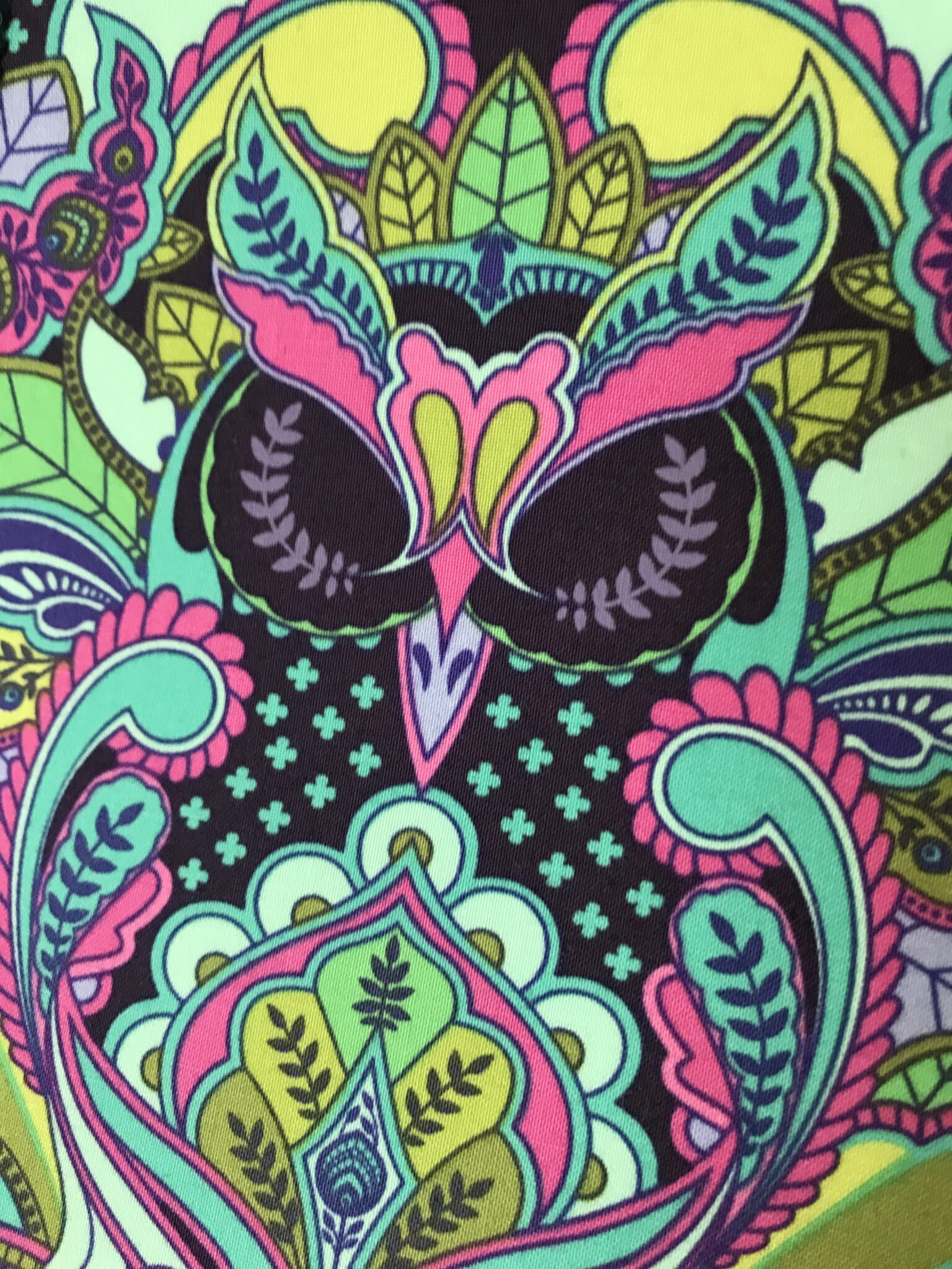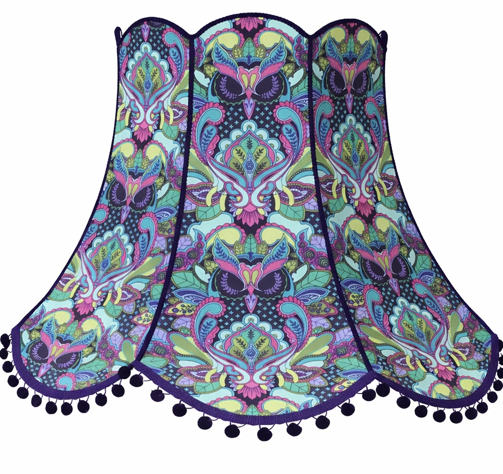 Make a bold statement with this striking, handcrafted lampshade, featuring an intricate design that combines stylised owls with flowing paisley motifs. A rich mix of teal, turquoise, lime green, and vivid pink is set against a deep navy background, creating a dramatic and eye-catching look.