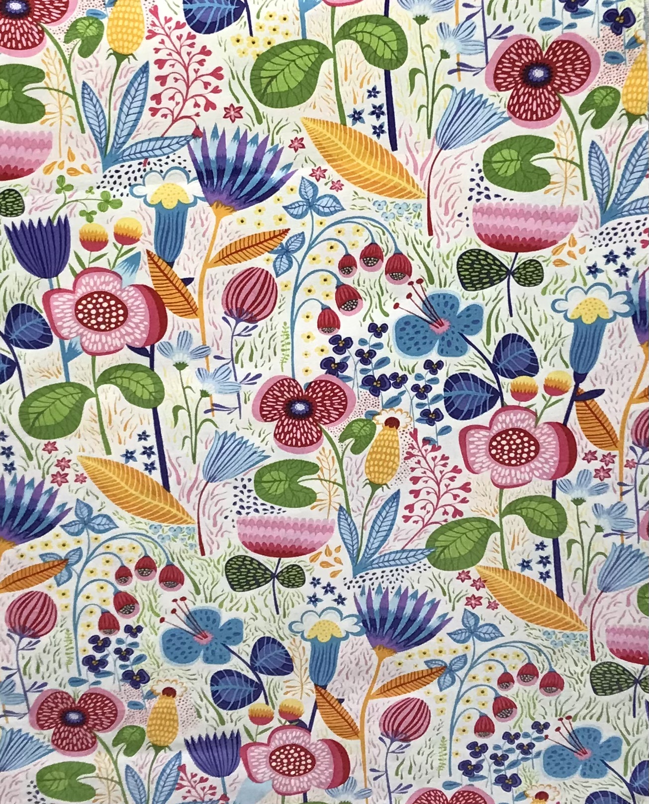 A lively botanical print inspired by Scandinavian folk art. Set against a soft, light background, an eclectic mix of stylised blooms, seed pods, and leafy sprigs dance across the fabric in a beautifully balanced composition.