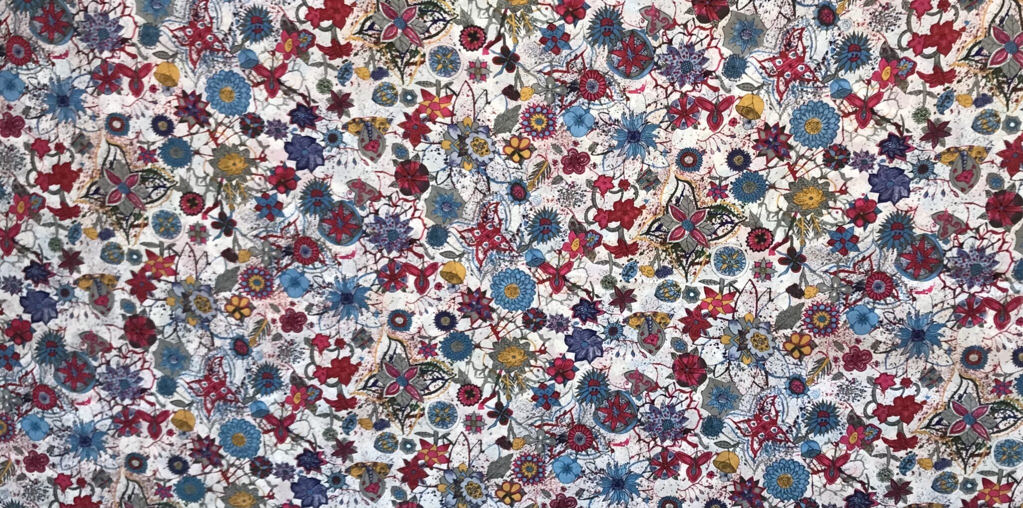 This Liberty fabric features a richly detailed tapestry of stylised florals scattered across a soft, light background. Intricate linework brings each motif to life, from delicate wildflowers to bold, star like blooms, creating a sense of movement and depth throughout the design.